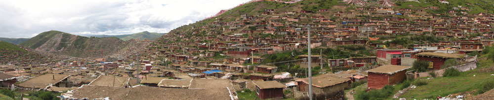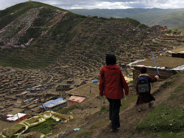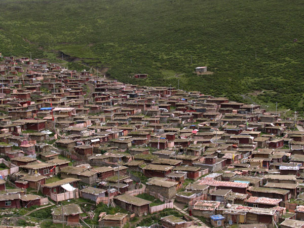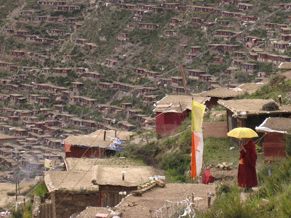 今天重要的一站就是色达的五明佛学院,出发之前笨笨给我看过照片,很酷。距离色达县城20公里的地方有一个路口,右转就是佛学院的入口。登记身份证之后,我们就开车上山。几个弯路下来,山谷中出现了一片片的藏式房屋,路上也有越来越多的僧侣。进入核心地带,绿色的山坡上遍布着无数红色的房子,把车停好,在里面乱逛,见到很多人还在继续盖房子。