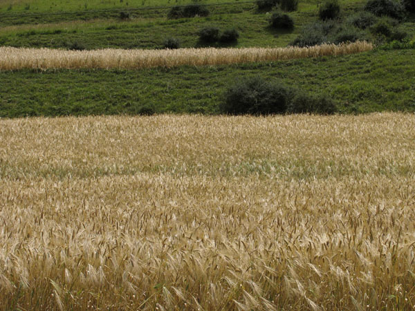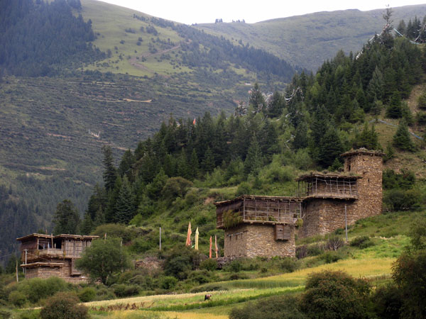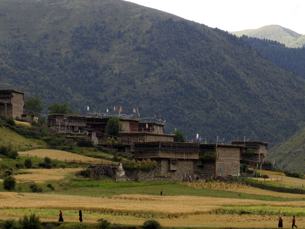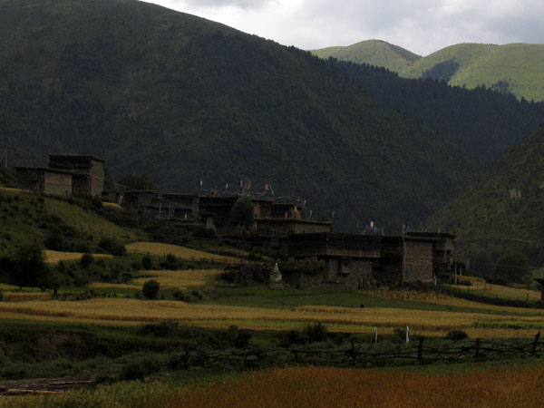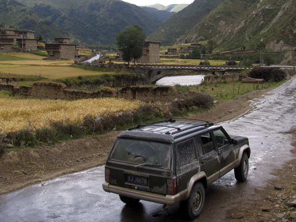 从国道下路,两旁一片秋收的场面,河岸边,山坡上,到处都是金黄色的青稞。这些天天气一直不放晴,厚厚的云层布满天空。只要走到黑云下,就会遇上一场大雨。