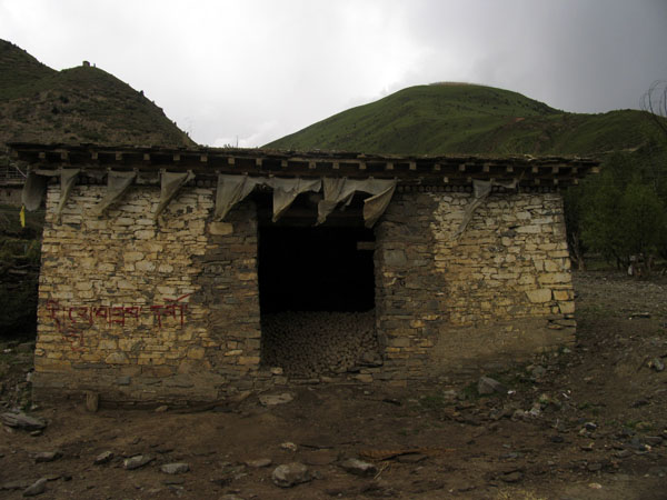 在路口,看到一个五六岁大的男孩,手里拿着一串钥匙,背着书包在路边,我过去问:我想去坛城,怎么走。他一下子跑开了,背对着我,指着上山的一条小路说:从这里可以过去。然后他就跑上了山。我和笨笨在后面跟着他走。他背着一个很旧的多拉A梦书包,头上是当地僧侣经常带的一种线帽,身上是标准的僧侣袍,光着脚穿着一双旅游鞋。