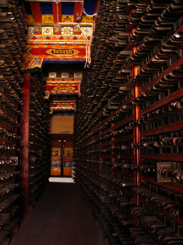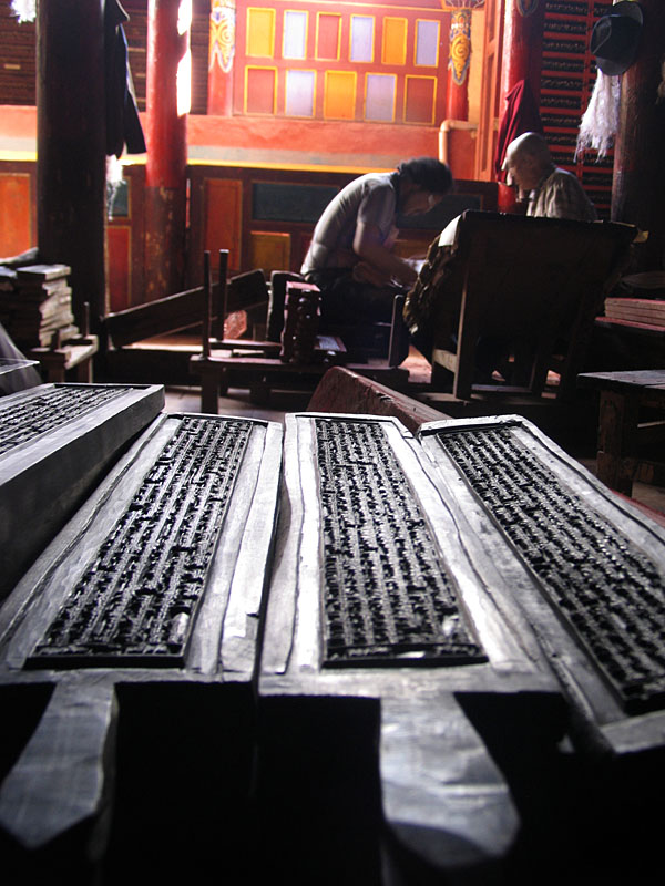 50元的门票不便宜,但既然已经到了,还是决定进去。毕竟,去年在遥远的阿里的寺庙中看到的经书,都是从这里印刷出来的,也算是文化中心了。本来没抱太大的希望,但一进“藏经楼”,就觉得这50块的门票值了。搞不懂是藏文不适合活字印刷呢,还是这里的印刷技术起源于活字印刷之前,无数的经文字版像图书馆一样,密密麻麻排列在到顶的大架子上,光线从窗户中透进来,不由产生肃穆的感觉。