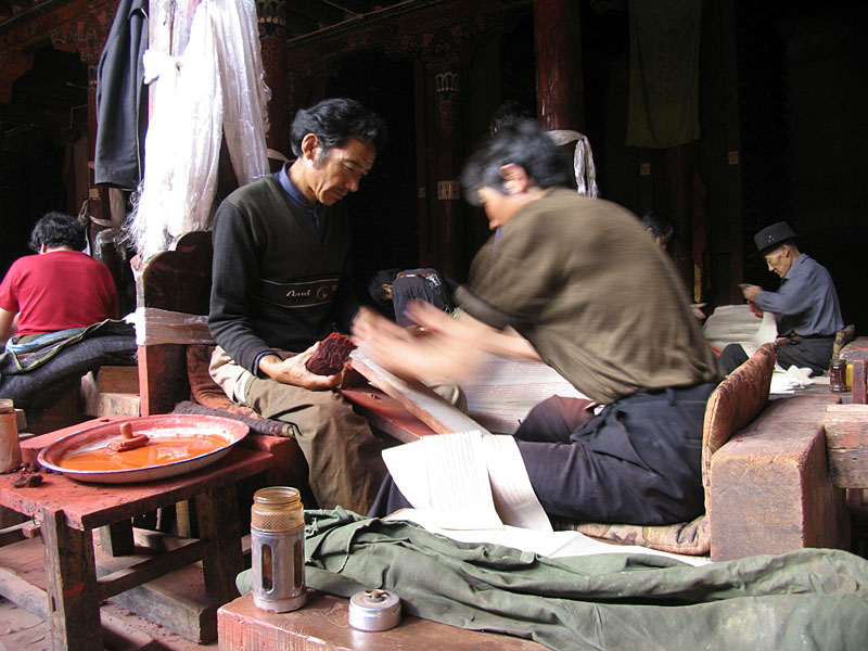 进殿前早就已经有明文规定不许照相,但还是忍不住偷拍了两张。印经人很热情,带我上二楼参观,十几个工位热火朝天的在工作。完全手工操作,动作极其娴熟。引导我的人主动要求:照相,照相。拿相机给他,被它当成摄像机用了。。。