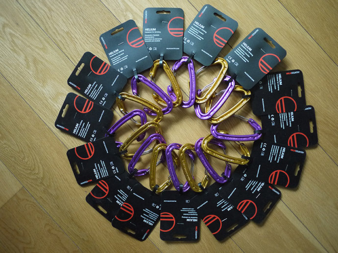 买了一堆小锁:Wild Country Helium 2 Clean Wire Carabiner。Jane放毒的结果:全尺寸,轻,不钩绳。8个金色,8个紫色,10.80$