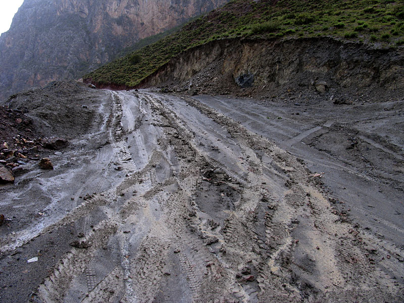 这条路非常的窄,而且全是调头弯,雨还在继续,而且越往上,雨好象越大。85之前告诉过笨笨,这路很陡,4500是上不来的,小切没问题。虽然有了充足的心理准备,但随着雨点的加大,难度也越来越大了。之前的路面还是碎石子,现在已经变成了红色的泥地,在雨水的冲刷下流着泥汤。在一个比较宽的拐弯处,我明显感觉到车在侧滑,笨笨一脚踩住刹车,坚定的说:往回吧,不上了。我马上表示同意。就在我们调头的时候,车还在缓缓的侧滑,危险呀。。。这要是滑到山下去,麻烦可就大了。