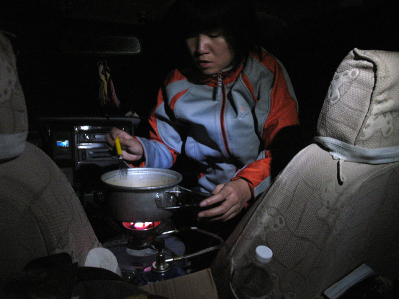 没一会儿后面又上来几个车,不同的人轮番跑到前面指指点点,但也都没有什么结果。 雨还在下,我教导笨笨说:你的人品实在不行呀,回去还是好好做人吧。 后面还是不停有车上来,都堵在一起。所有司机都要跑到头面看看情况,再无奈的回到车里。 我和笨笨把车里收拾出来,我在前座,笨笨在后座。然后开始煮面吃饭。 天完全黑下来了,车窗上全是雾气。我们蜷在睡袋里,不知道明天会如何。