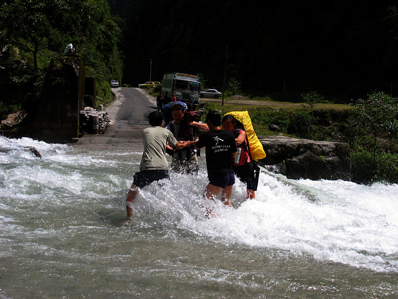从这里到加都的车费本来应该是500R/人,但今年雨季雨水很大,把路冲断了,在海关时两个中国人告诉我们,路只能分段走。 可以直达加都的车(越野车)都涨价,我们先包了一个小车走了5,6公里,到达第一个断路处。这里的路是过水路面,就是说路是水泥的,专门让水从路面上流过。其实并没有断,只是山上下来的水太大了,小车是过不去的。旁边有当地人架了一个桥,但要收费。我们四个决定趟水过去。脱了鞋,笨笨拉着我向水面走过去,已经过去的几个中国人冲着我们又叫喊又比划,但河水的声音远远盖过他们的音量,完全听不清。 走到中间的地方,发现水非常的急,一只脚抬起来就会感觉要被冲走。对面的人是想告诉我们不要并排走,走成斜线会安全些,看我们没反应,其中一个瘦瘦小小的男生直接冲进水里接应我们。