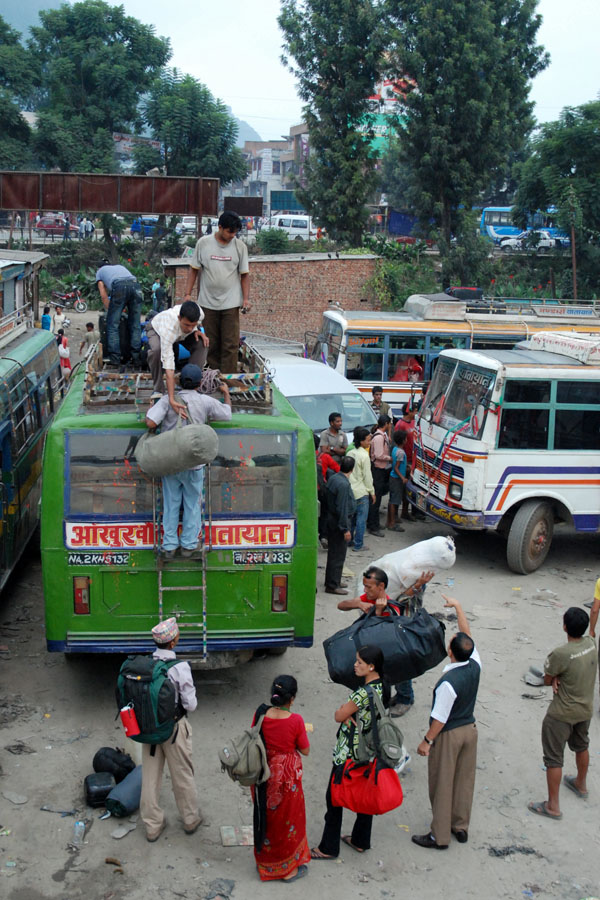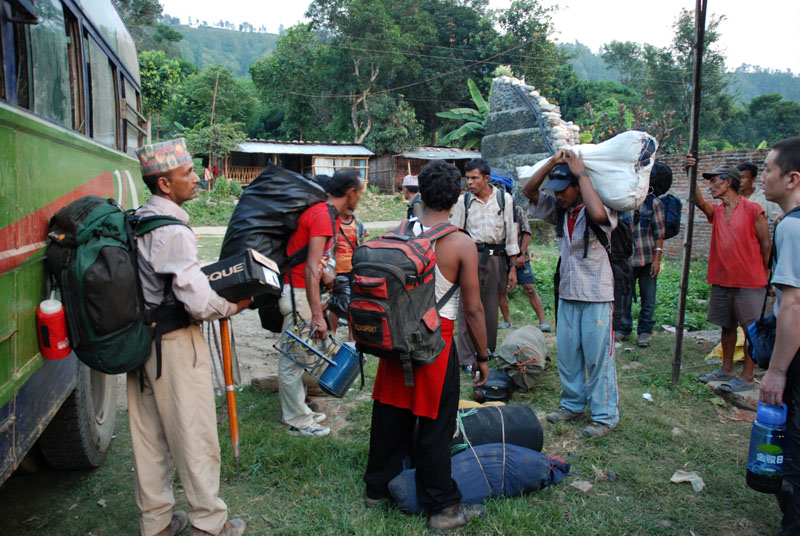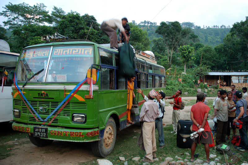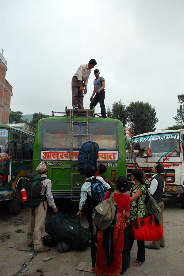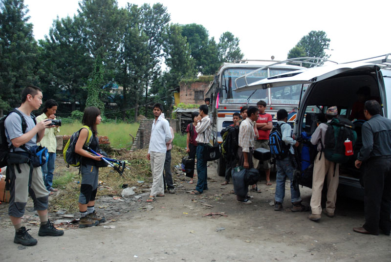 agency的大小老板都跟着过去送行。我们坐的绝对是local bus,从车站就看得出来,脏、乱、差。哈里(guide)和porter被我们合称为:哈里波特们,把包装上大巴车顶,给我们安排好坐位。7:05车开出车站,我还挺高兴,算是正点,但结果今天130公里的路程我们开了12个小时。