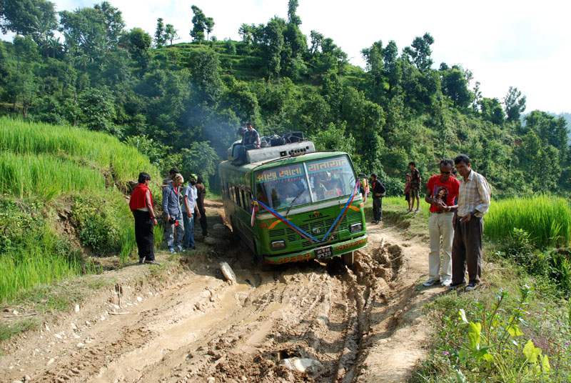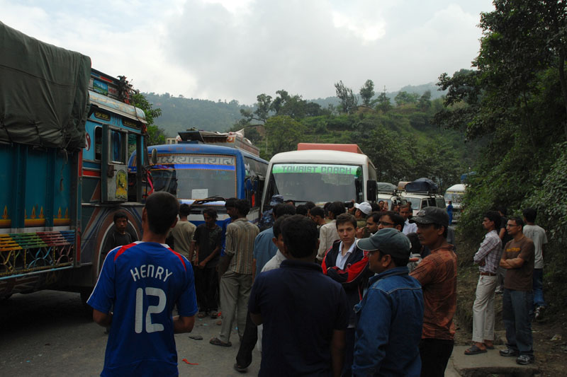 在市内不停的拉人,全都站着。出了加都也就是10公里就碰到大堵车,笨笨马上跳下车,去看热闹了。风问哈里啥情况,答:accident。