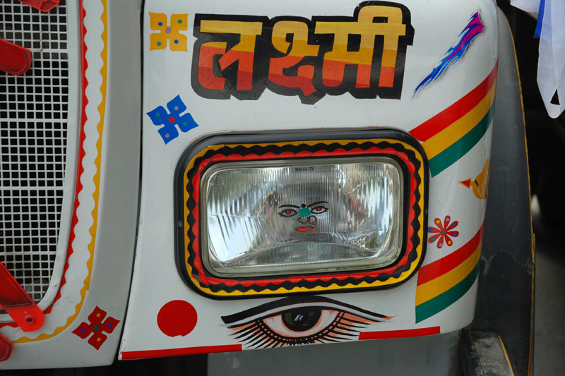 本地大巴和大卡车下面的保险杠上总写有各种英文,看到:speed control;one love;speed limit;low speed, long life;time for love;with lots love;life is on road......还有画大眼睛的,很有意思。大家车型一样,但名曰:装修不同。因为马上要过节了,很多车上都点了红色的tikka,很喜庆。好不容易过了堵车路段,天气越来越热。昨天晚餐风喝几口柔柔的lassi,但他无福消受,晚上开始拉肚子,我和柔柔都好好的。