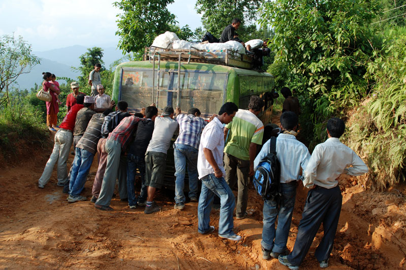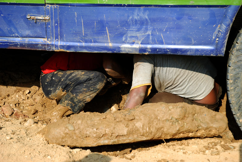 过了几个大镇子,车开始在山里爬升。路越来越窄,错车都是大家倒来倒去的让路。在越野路段大车沦陷了,没有绞盘,没有猴爬杆,本地人用的就是土办法:有坑填坑,有石搬石。笨笨一度已经绝望,游说哈里去旁边的村里租个jeep前行。哈里镇定的说:半个小时,他们就能搞定。我们在车上热得不行,全找树荫里躲着。风已经在暴躁的边缘,但半小时过去了,我们果然上路了。