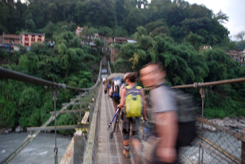 约的6点去agency,然后去做7点的大巴,到达徒步的起点:arughat。用笨笨的手机上了5:30的表,还叫了GH的morning call。但早上表响了,morning call没来。洗漱、收拾好包就轻手轻脚的下楼去找风和柔柔。我们从5楼刚走到3楼,笨笨一看带的手表:怎么才3:35?我晚上跟蚊子搏斗了很久,已经迷糊了。笨笨有条理的告诉我:手机的时间还是北京时间,所以我们早起了2小时15分。没什么说的,上楼继续睡。这次morning call如约而至。