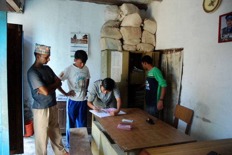 过了有十分钟,风还没有回来,我有些着急,问哈里到底是什么人在跟风说话。话音未落,风跟porter们一起走了回来。风说他们只是解释了一下今天为什么这么慢,因为没有雨衣,怕行李淋湿,他们等雨用了1个小时,吃中饭用了1个小时。还向风保证,明天一定可以到Tatopani。因为我们明天是一定要住Tatopani的。Tatopani在尼泊尔语里的意思就是:温泉。我们不想错过。