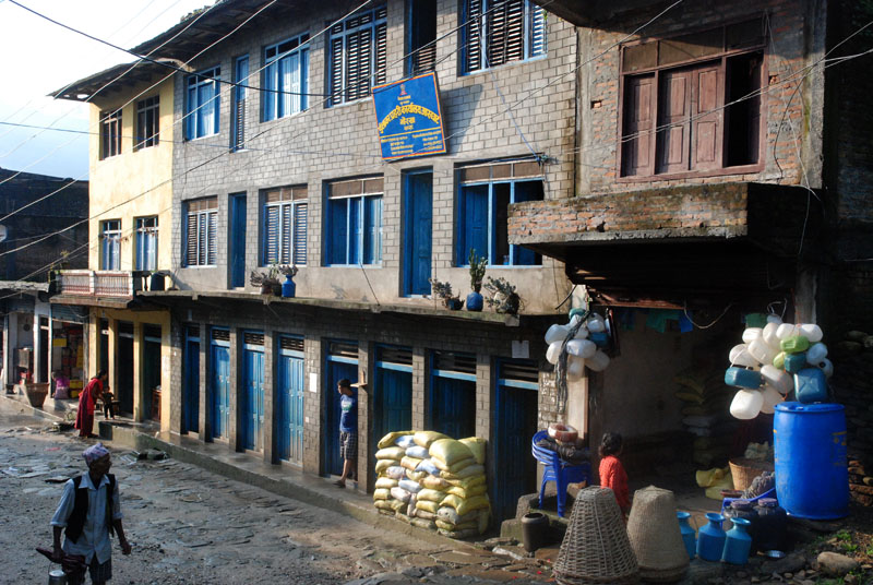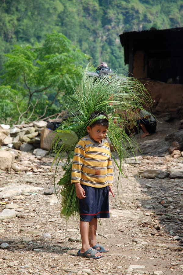 天还亮的时候,哈里问我们晚餐吃什么,但这个问题完全没有意义,因为这里也只有dal bhat。(尼泊尔套餐,就是蔬菜咖哩,米饭,外加酸菜和豆子汤)。但天快黑了,还不见有人做饭,让哈里赶紧通知老板和老板娘,老爷们都饿了。大厨(老板)开始不断切土豆、洋葱、大蒜。切了炒,炒了又切。我们4个简直快要眼冒金星的时候,饭终于上桌了,费了这么多事,饭菜还是那个味道。徒步的日子,中午我们只吃自己带的路粮(锅巴,饼干,栗子,糖等),每天都指着早晚两餐,所以晚饭总是被我们一扫而光。我们在山里的时候从来不会浪费食物。