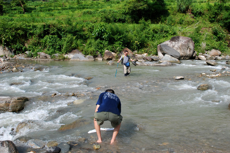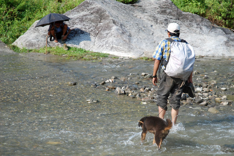西班牙队伍今天跟我们交替领先,好象谁也不愿意落在后面。11:10,笨笨在后面突然喊:到了,这里就是Soti khola。他这次带了新玩具(GPS - Garmin Oregon 300),里面有nepal地图,还有提前输入的很多路线和标记点,可以精确的知道前面的距离。我们都觉得太早,提出再走一站。哈里说等porter们来了再决定。