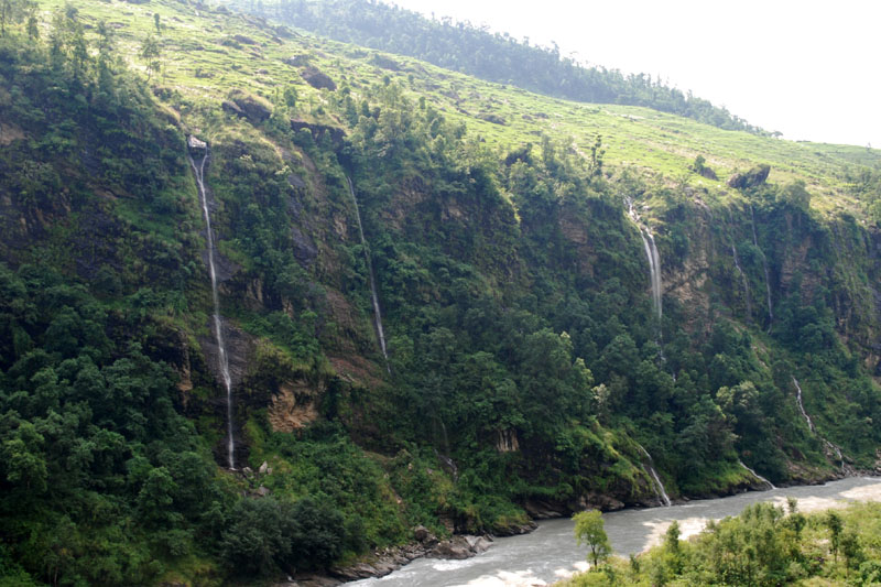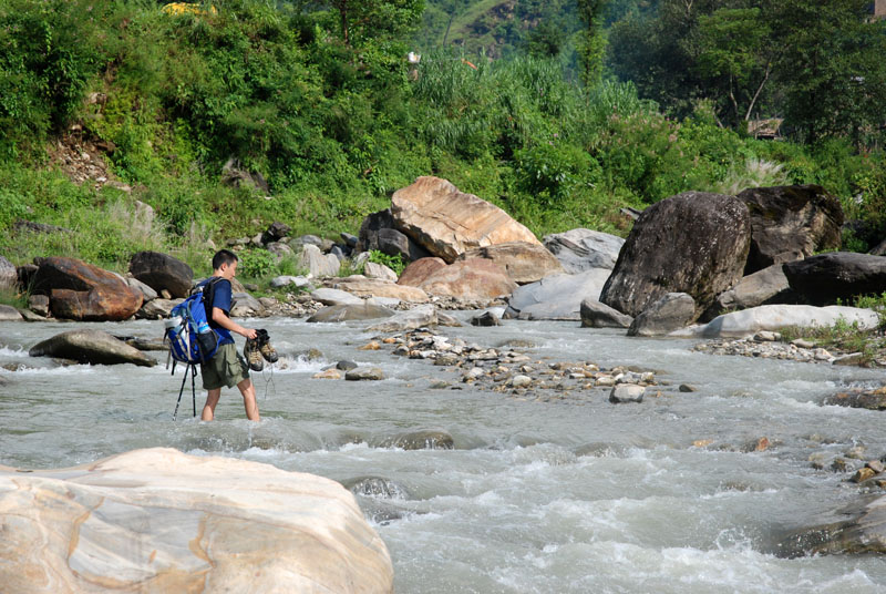 我们沿着一条大河向源头走,河对岸开始出现各种大小瀑布。在某个位置发现瀑布们从山顶一直到山下河中,并排8条。河岸上的稻田一片翠绿,绿得简直晃眼。我们4个打算用今天热身,不走太快。今天没有上升,也不觉得累,只是被热的大量出汗。路上几次过河,感觉自己的脚补扎了一下,抬脚的时候,有一种什么东西被拔出的感觉。因为不影响走路,没管它。