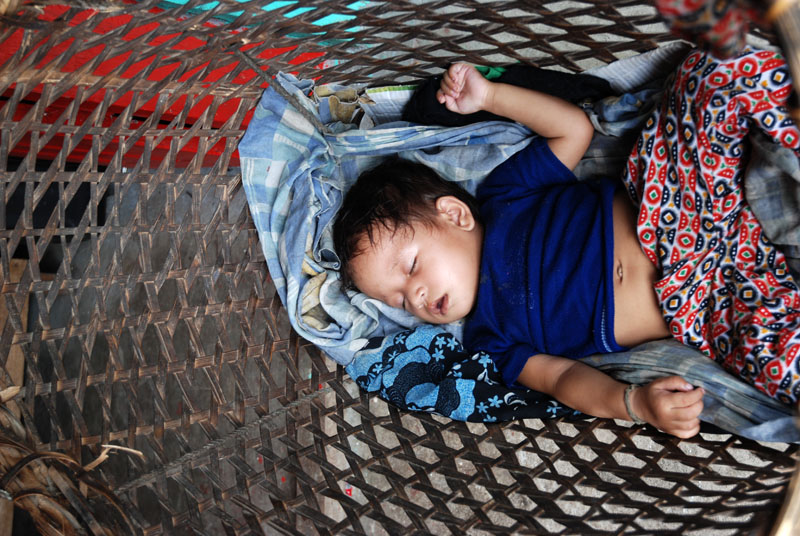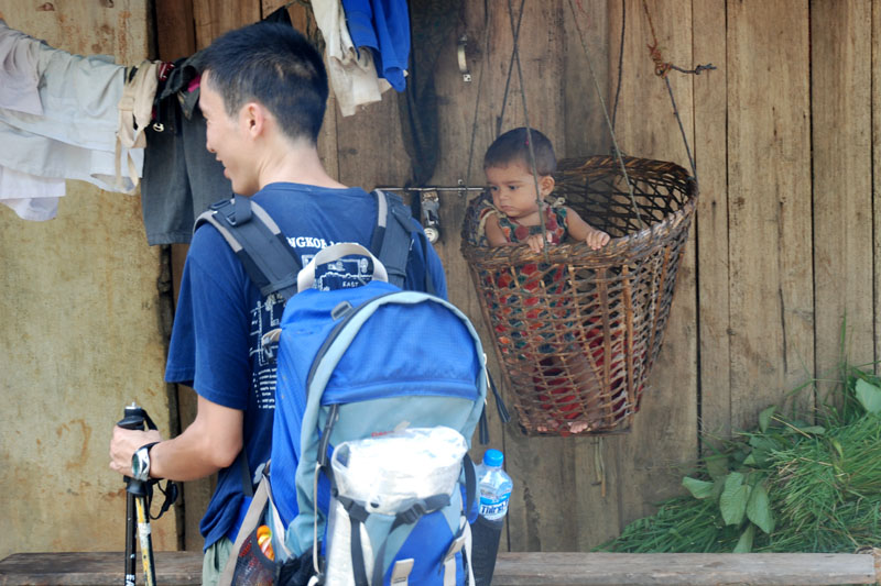 早上表响的时候,外面好象还在下雨。风和笨笨两个人各自躺在帐篷里交流了一下,看天气放晴,才决定起床。6:30,定的早餐已上桌,吃过后我和哈里去check post登记。哈里波特们用的帐篷很简陋,没有底,几根笨重的钢杆支起一个帐篷皮,昨天半夜估计也都是跑进半成品建筑去睡的。登记回来,发现他们还没有收拾完,我们不等,跟哈里打过招呼就出发。天气闷热,身上很快就湿透。哈里看老爷们走了,跟porter们交待了一下就追上了我们。