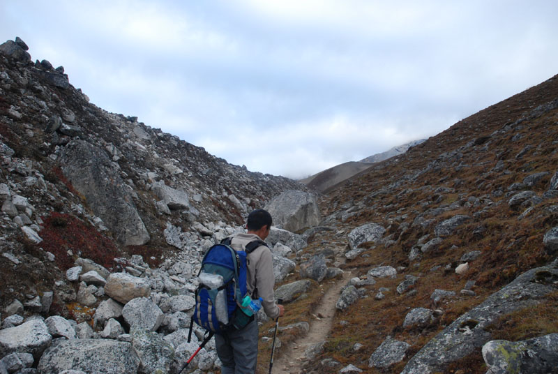 porter们知道今天路上没什么可偷懒的地方,所以一直在我们前面逛奔,我们只能远远的望到他们的背影,每次快要赶上休息中的porter的时候,他们又立即出发,消失在我们的视线之内。