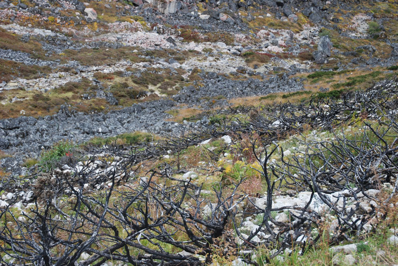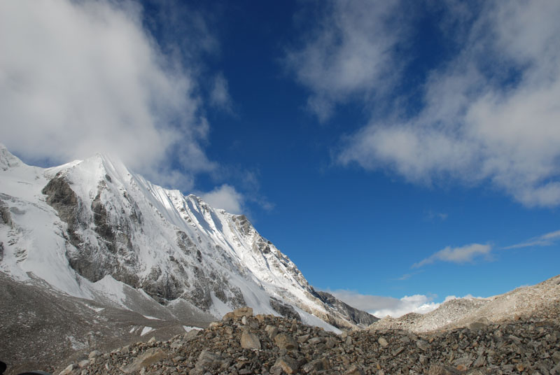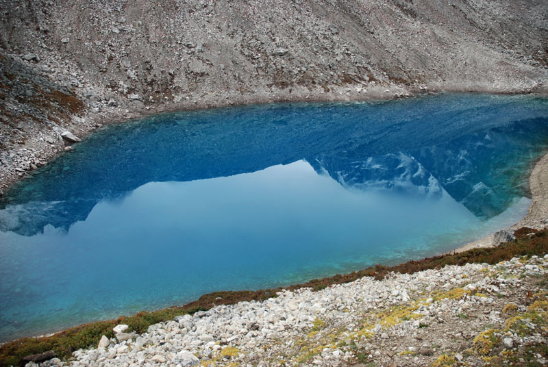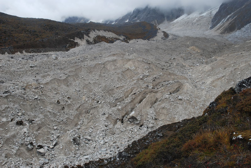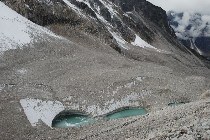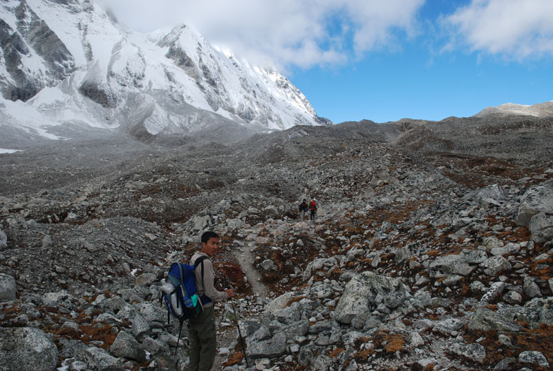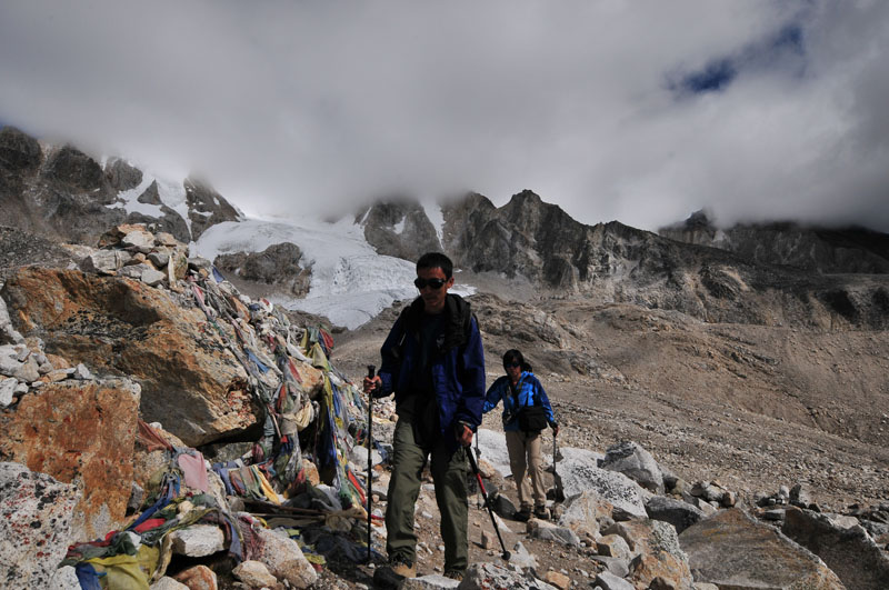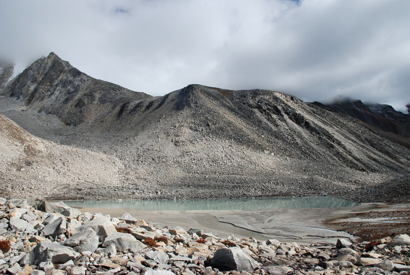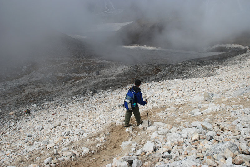 下山的路还是碎石,右侧有一条很长的冰川一路跟着我们,离开山口,意味着我们也要离开这些景物。下坡的路上都是西瓜大小的石头,躲也躲不开,踩也踩不稳,走快了感觉全身都在扭来扭去。过了山口,心理上就放松了,反而走得有些累。
