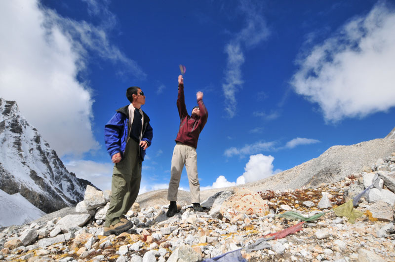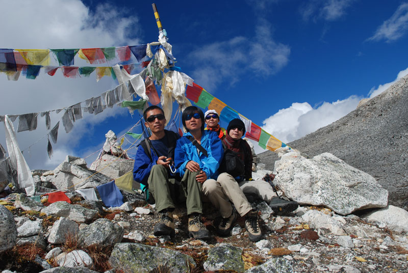 这个山口有好几个小坡,也搞不清楚哪个是最高点。有2、3个地方都挂着经幡,我们选了其中最大的一个,派笨笨和风也去挂上我们从拉萨带来的经幡。顺便合影留念。
