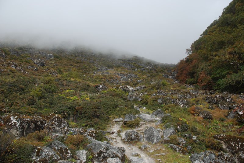 天上的云还是很厚,看不到Manaslu,看不到其它雪山。跟着笨笨慢慢向上,尽量不停下来,免得重新起步又要花时间调整节奏。早上被笨笨塞了太多东西,胃里象顶了一个什么东西,走了2个多小时,才开始打嗝,证明胃开始消化工作了。上了高海拔,我的胃口变得很不好,总是吃不下太多东西,笨笨就总是希望我可以尽量多吃,只能努力。