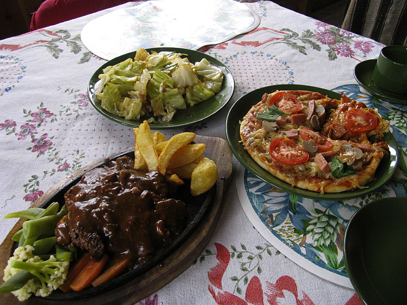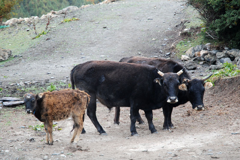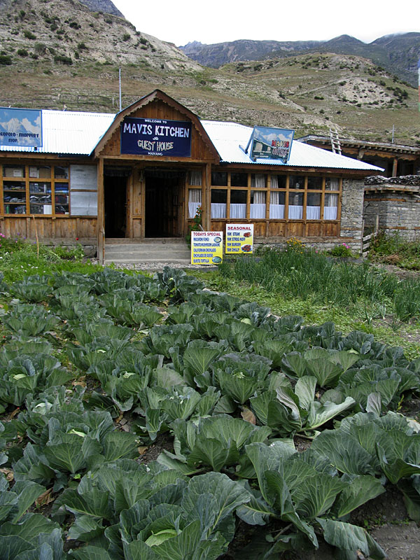 manang的商店,面包店更多了,我们勿勿浏览了一下,马上杀入mavis餐厅,先跟老板娘唠唠家常,套了一下近乎,迅速点了4个yak steak。等饭的功夫,我们去旁边的商店转了转,买了几块巧克力。最近笨笨患上食品焦虑症,总觉得背得那30多公斤食品不够吃。每次从驮袋里拿食品出来,我和柔柔都很有心理负担。所以我打算沿途再补充一下。老板跟我们聊天,一听说我们是从中国来的,马上说了一句什么,我们谁也没听懂,他解释说是别的人中国人教他的,我们仔细辨别了一下,应该是广东话。看来我们需要在本地推广一下普通话。
