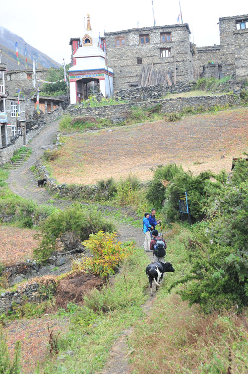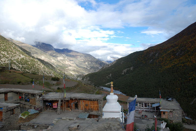 重新上路,地图上标注2.5小时到Khangsar,沿一条新的河谷上了2个大坡,远远就能看到村子里的小白塔。出manang的时候就有些下雨,一路也没停。