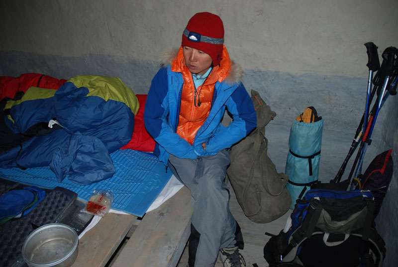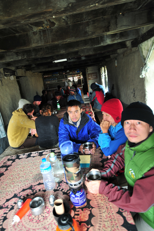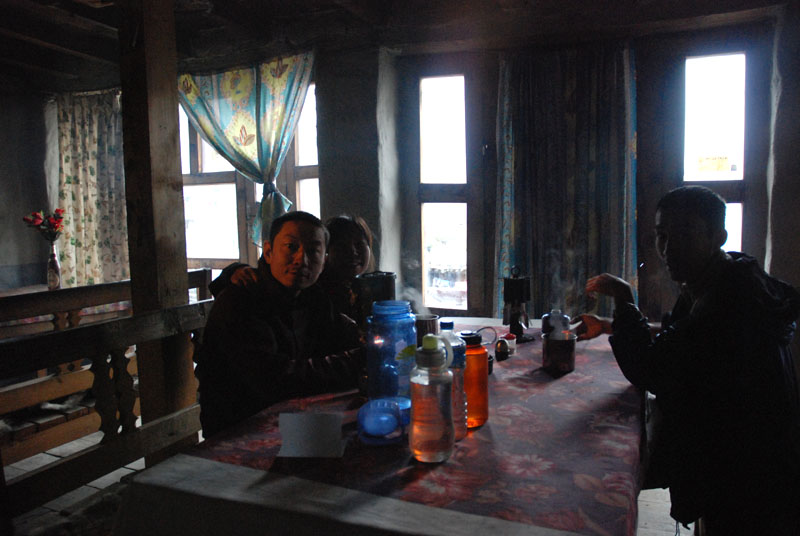 昨天good news的2个大团队今天却没见到,哈里又要焦虑了。一个小时之后,porter们到了。天气太差,再往前走去露营会麻烦一些,哈里还是决定住在这里。这里独此这一家guest house,食物都很贵,房间也紧张。好在我们到的早,抢到一个3人间,把床拼在一起就能睡下我们4个了。鬼子们在这里都是一人一小碗方便面,吃得很惨。我们在餐厅里混了一会儿,自己用快烧炉,GAS烧水,喝茶。一路上光这一项就省了很多很多钱,因为越是艰苦的地方,热水的价钱也越贵,这里小壶,大概2杯,就要100RS(10RMB)。我和笨笨回房睡觉,躺在睡袋里就感觉暖和多了。4点多起床,回到餐厅,风讲述了TBC GH的老板怎么企图把我们这拨不消费的客人赶出房间,让给后来的鬼子。风就大怒,找哈里和老板分别大吵一架,就没人找我们麻烦了。