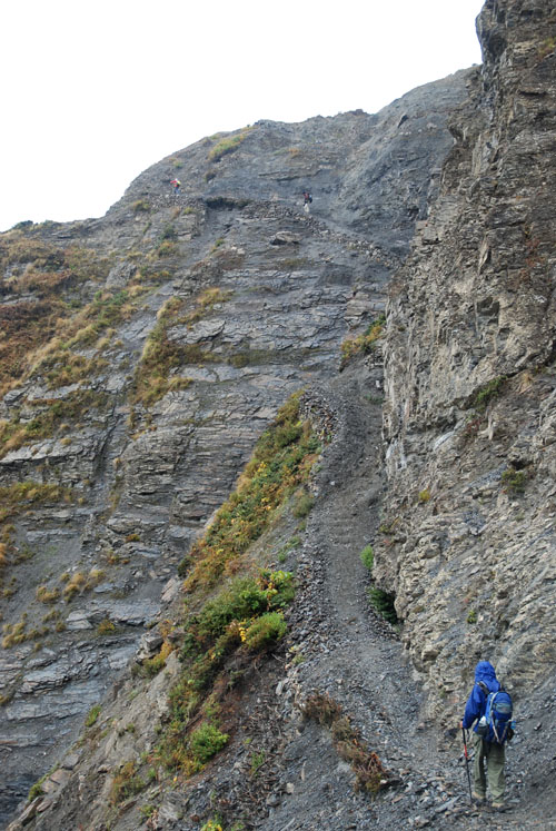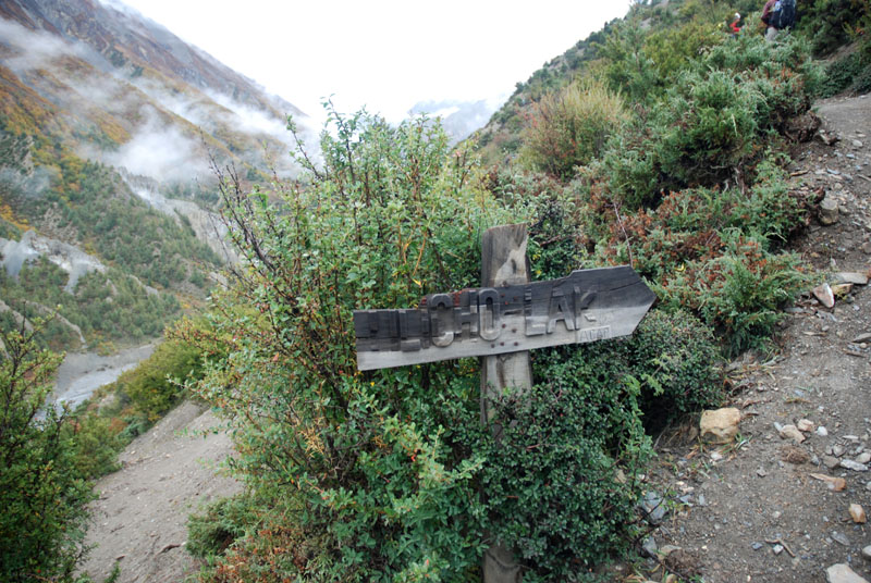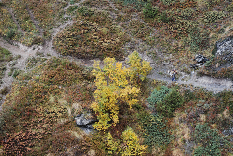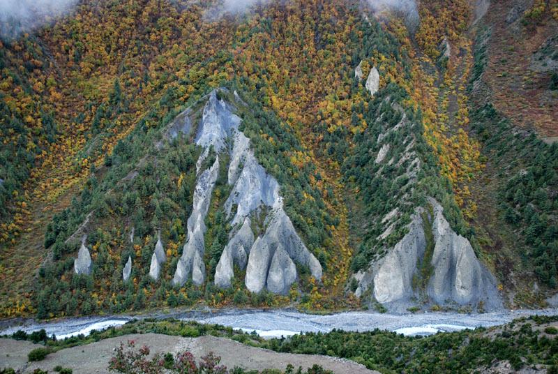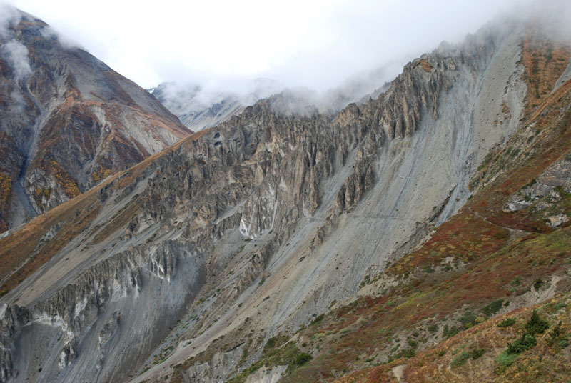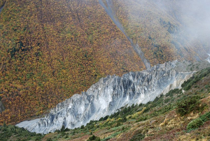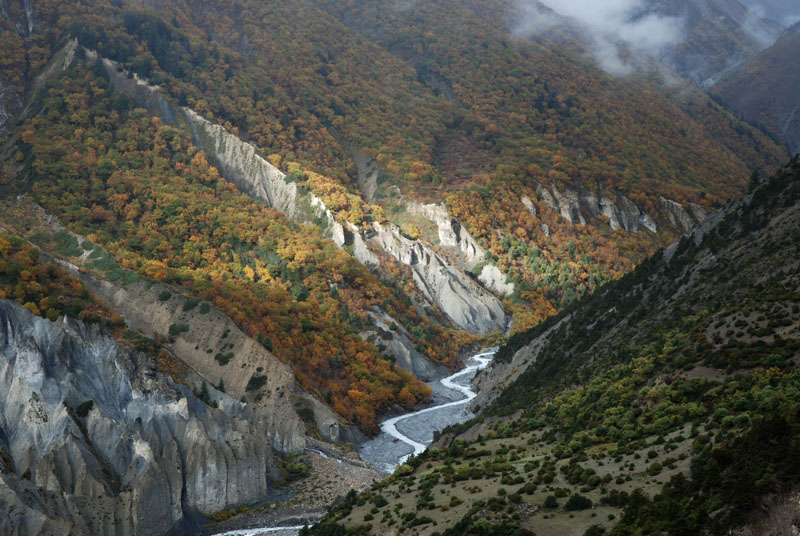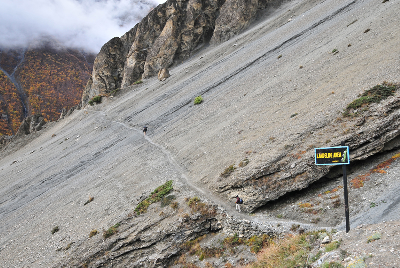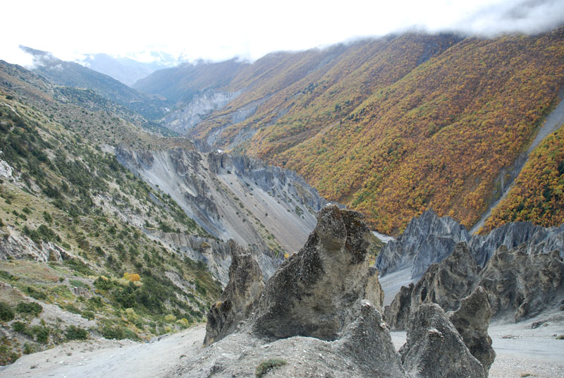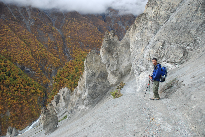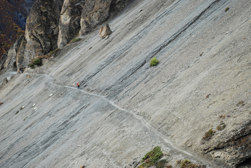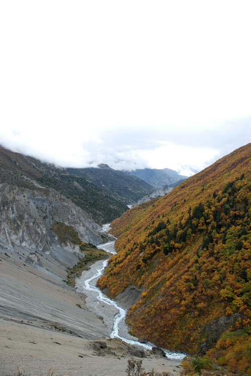 昨天晚上吃的炒饭不错,今天早上还是要了炒饭,我的这份完全吃不掉,分给柔柔和风。porter们看着也不着急,最后还是我们先出发了。一段一段上山的小路,河谷下面那条白色的河流如静止一般,如是不是山上流下来的小河汇入其中,我们只当它也是静物了。对面山上覆盖着厚厚的植物,都是金黄色的,只可惜没有光线,否则一定是人在画中行。我们走在这一侧山脊则荒凉一些,远处塌方的地方清晰可见,我们要穿越而过,最近天气还好,塌方区也还算稳定,如果让我们去绕道山上,就会辛苦很多。路上碰到3个尼泊尔青年,也是游客,一直在我们前面走,当路上出现积雪时,他们就有些不会走路了,越走越慢,总是怕滑倒,我和笨笨就超过了他们。