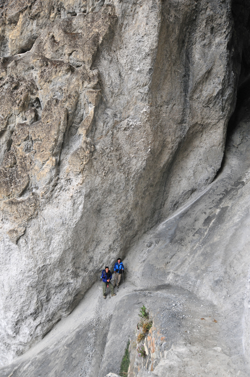 迎面有一些下山的鬼子,多是健步如飞,还有2个可爱的老头,满脸笑容的说着:namaste(尼泊尔语:你好)。走了1个多小时,才到lower line和upper line的分叉处。lower line就是走塌方区,长年的塌方让山变化了形状,一些奇特的造型让你感觉不到身在何处。塌方区的小路也是有人清理过的,不算难走。因为没有降雨,也不危险,只是偶尔会有一些小石子滑落。