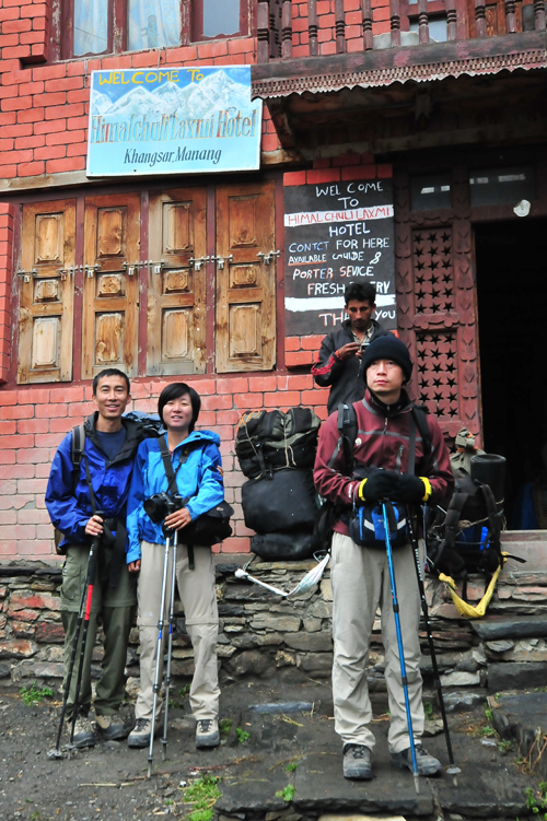 拐过一个弯,就能看到TBC(tilicho lake base camp)Guest House。10:40大家就都到了这里。天气还是浓雾,似乎还有一些小雨,我们又开始等待我们的porter。外面很冷,餐厅也不暖和,停留在这里的游客都是把自己所有的衣服穿上身,有个大块头连浴巾都裹上了。