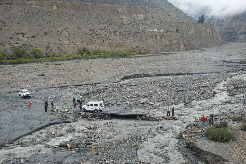 冒着小雨,我们向marpha走去。出了Jomson,就看到路上的桥被冲断了,连续几天的降雨在尼泊尔这种脆弱的地方,一定会引起很多麻烦。