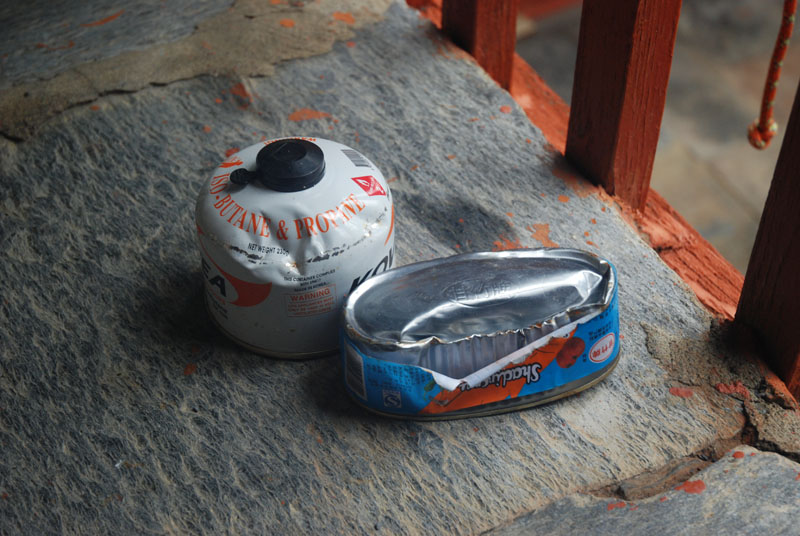 我和笨笨很饿,在房间里煮了面吃。昨天的摔包事件让我们食品驮袋里的GAS,罐头全变了形。风的大包被摔开了,肥皂盒摔丢了。最糟糕的是,porter们的帐篷皮摔没了,只找回了帐篷杆。哈里昨天没告诉我们,今天他试图在这里联络加都的经理,但没有成功,所以才告诉我们。他建议我们先走出大环,回到dhaulagiri线路结束的beni,后反走dhaulagiri环线,再回到marpha,被笨笨直接拒绝。