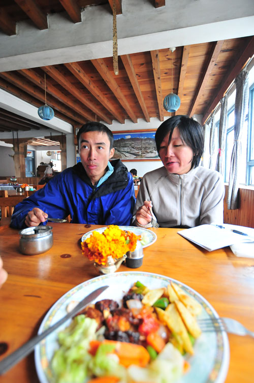 晚上吃饭,餐厅里聚集了很多很多鬼子,都是在这里等天气。我们又回顾了一下tilicho lake的那个向导,我们开始管他叫小飞侠。因为他穿着胶鞋,披着雨衣,勇往直前的样子很象侠客。然后就说起小天真,一致认为他是被累吐血了。