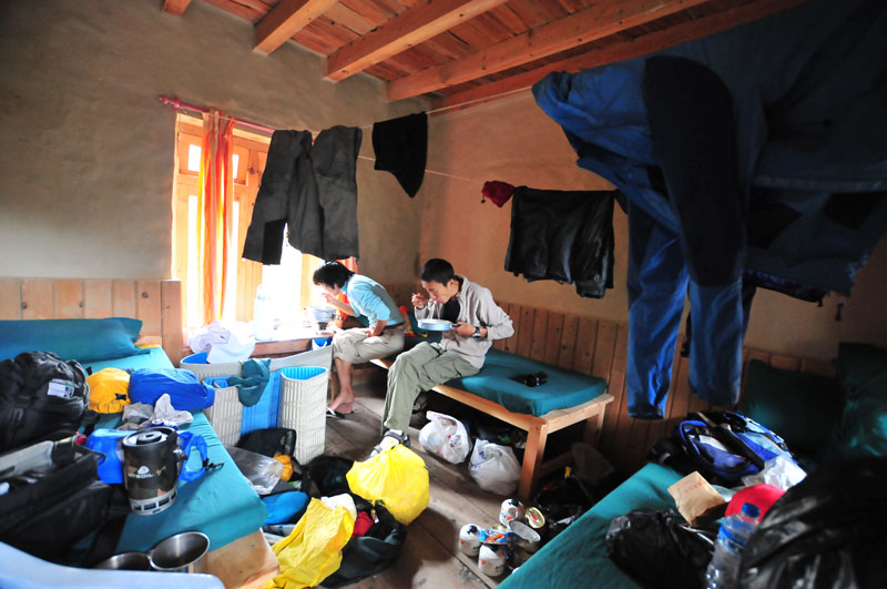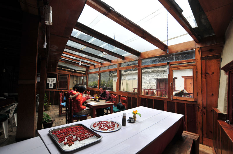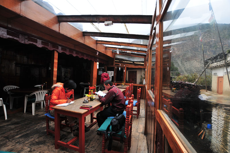 走到marpha的时候,雨下的正大。但我们的Sunrise GH里面真是别有洞天。阳光餐厅,2层楼的客房,一看就是一个等天气的好地方。我们把所有湿掉的东西都晾在走廊里,2顶帐篷引起了旁边鬼子的好奇。原来他们两个也是要去dhaulagiri的,但不是去徒步,而是去路上一个叫dampers peak的山头登山。