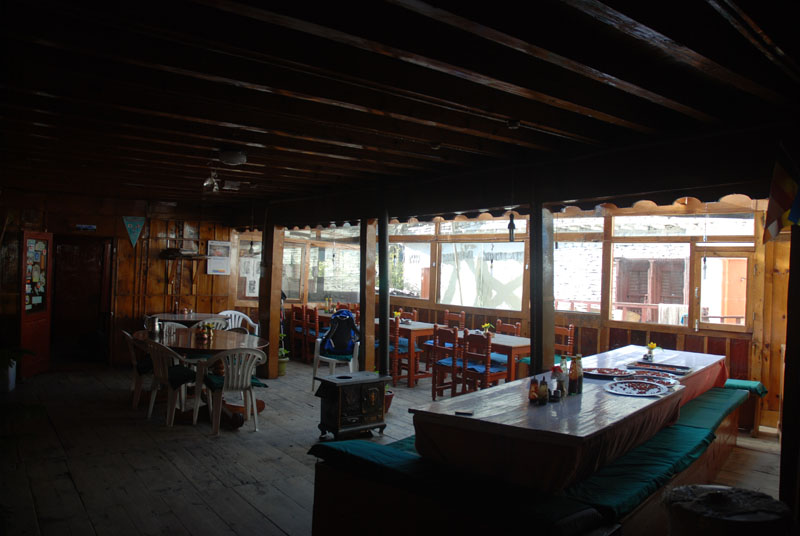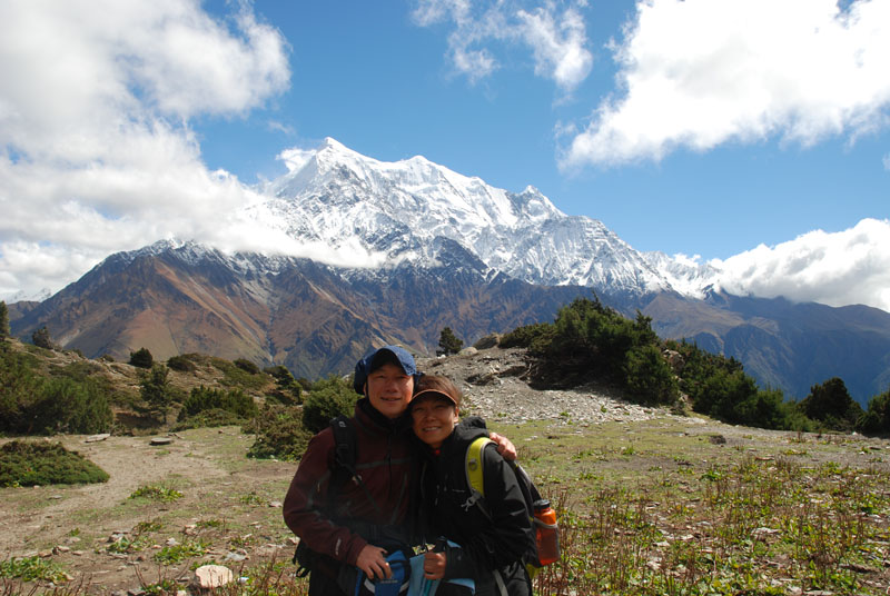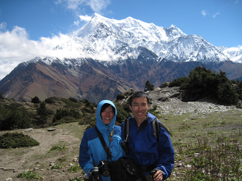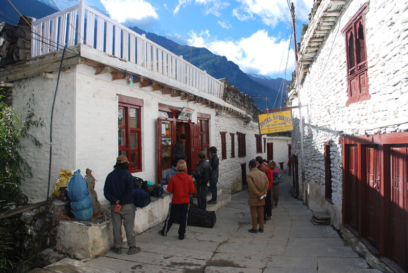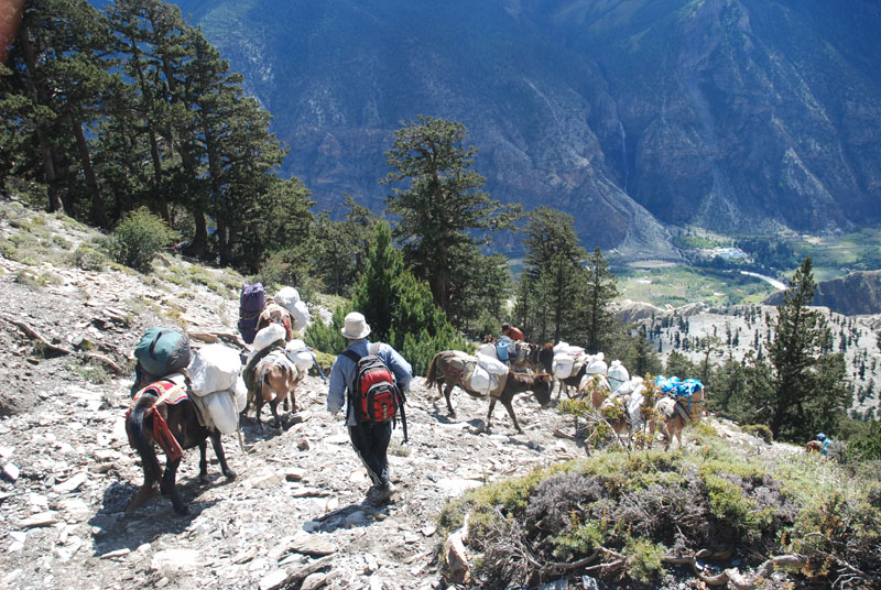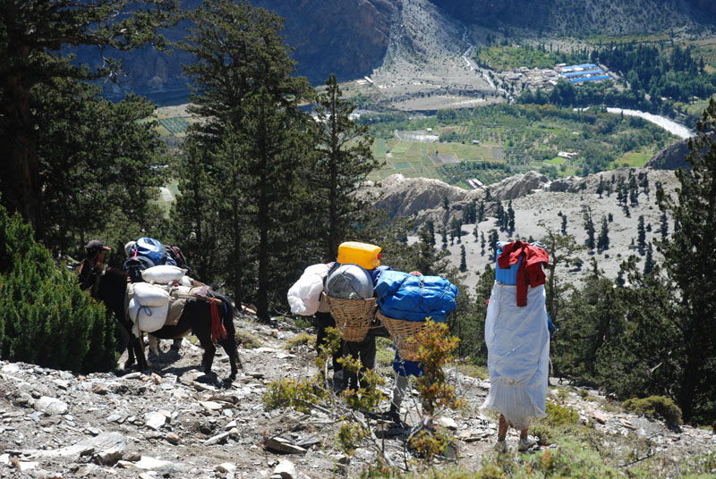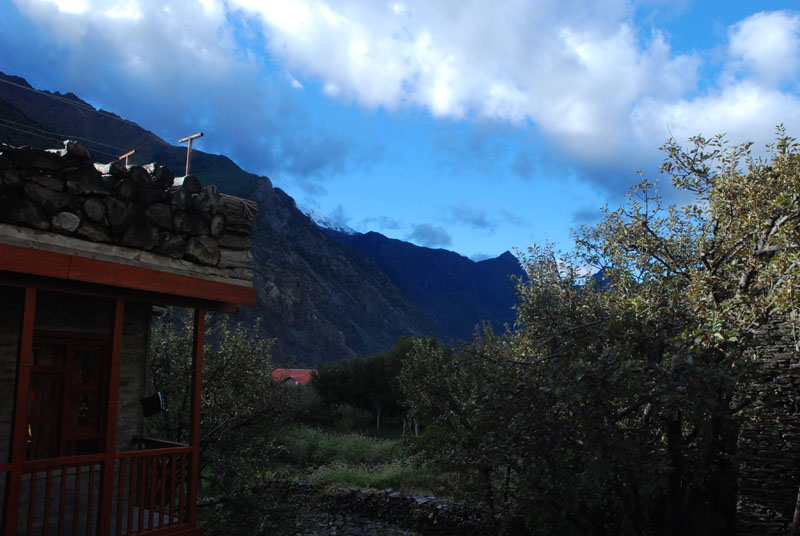 9点终于出发,从村里有一条路直接上山。什么也不用想了,往上走就对了。重新找回上山的节奏,完全不觉得累。天气很好,回身可以看到山谷对面的一排小雪山露出了山尖。山上有背夫下来,看样子有队伍下山,过了一会儿就看到一支驴队。和当地人打招呼,知道他们是从Yak Kharka下来的,驴队之后就看到了一些老爷,象是日本人。一问还真是,以为我们是韩国人,问问山上天气如何,他们说:风很大,非常大。