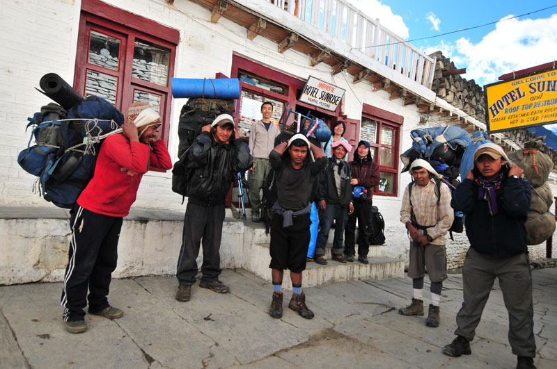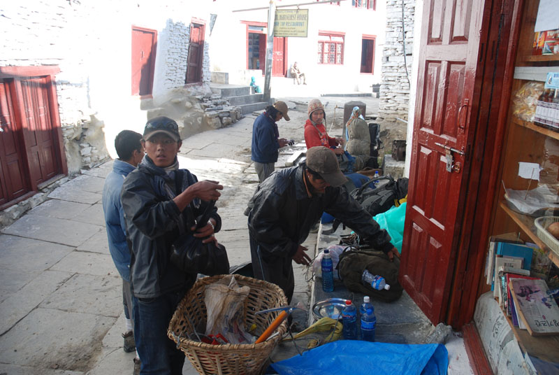 我们结帐,2天花了4065,真是贵,哈里波特们也结了1700多。guru三兄弟终于来了,他们开始分配包,再把自己的行李重新打包。三兄弟自己带的包都很象样,其中一个还用了一个迪卡侬的水壶。黄格子现在也积极组织porter,很是好好表现。