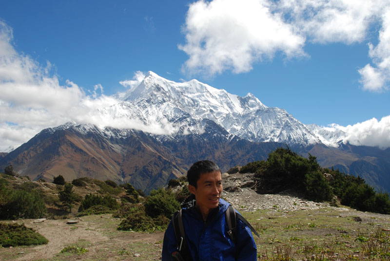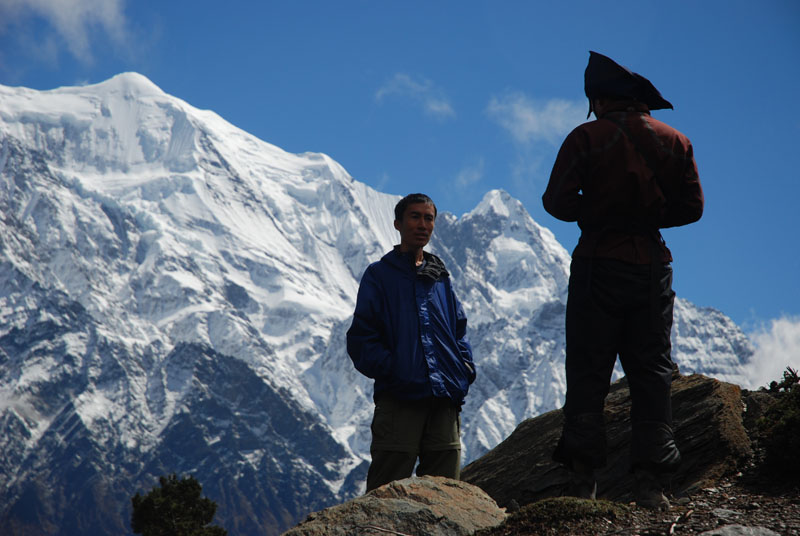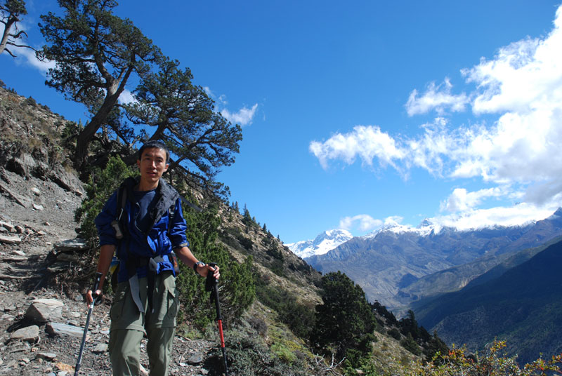 山上植物很稀少,往上多走一些,才看到松树。下面又上来一些鬼子,走得很快,在一个平台超过了我和笨笨,看样子象是两对父子。他们说是从奥地利来,本以为他们也是去dhaulagiri,结果人家只是要走到Yak Kharka,然后下去到mustang,也没带任何随从。