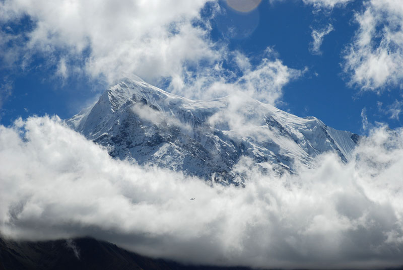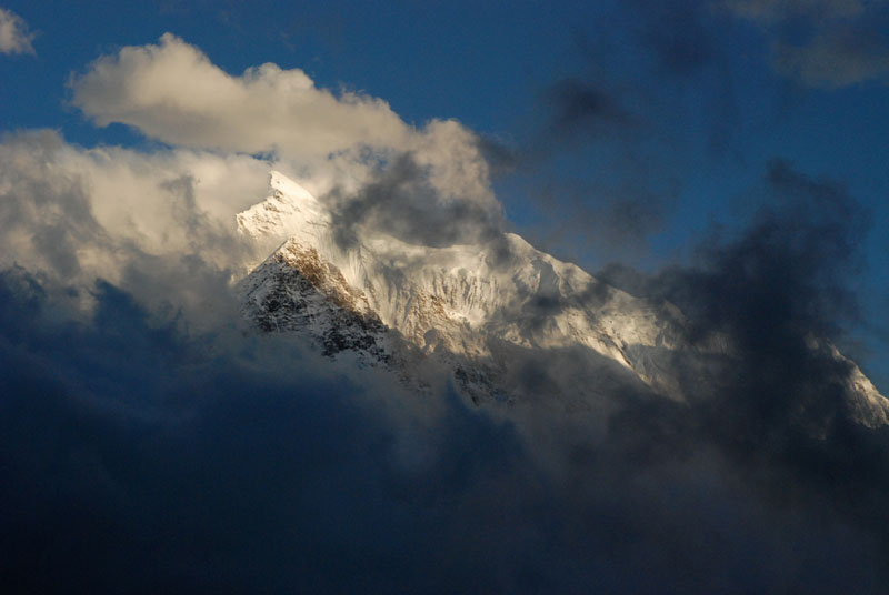 到了一个小山头,身后的NIlgiri已经完全显露出来,浮云还是在山谷里飞跑,风很大,我和笨笨不确认继续的路在哪里,看海拔,我们已经到达预计的高度,但这才走了2个多小时。用对讲机顺喊不到风,哈里波特们还在后面没上来。奥地利鬼子已经在吃中饭了。笨笨让我原地等,他下去找哈里波特们。虽然有太阳,但风大,还是冷。等了20多分钟,吃了一些干果,饼干,笨笨回来说他们都在后面,一会儿上来。风走错了路。