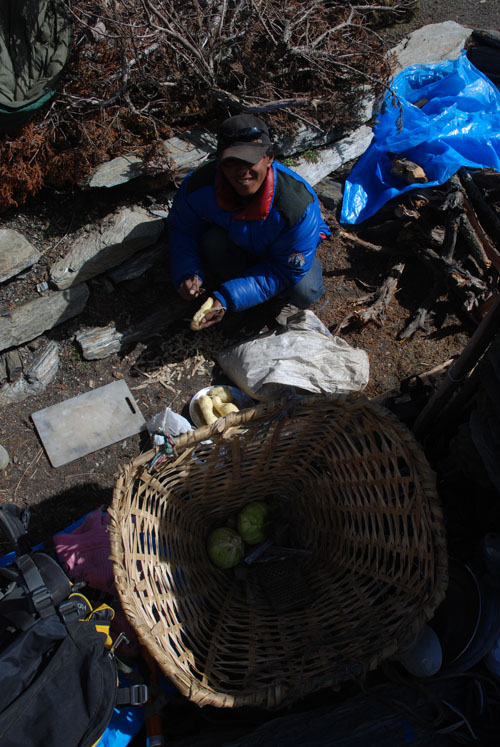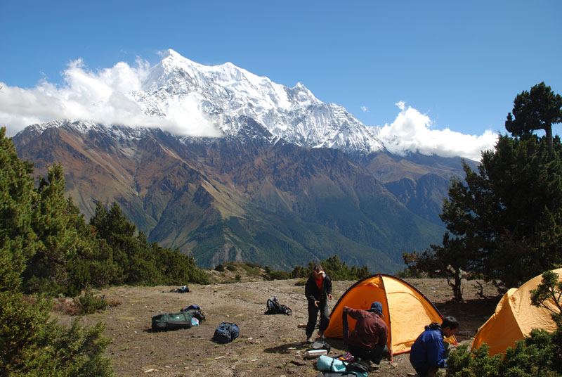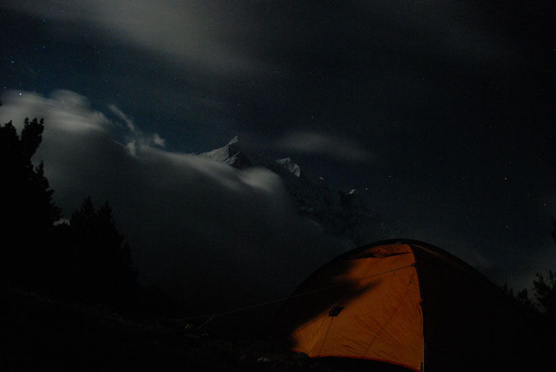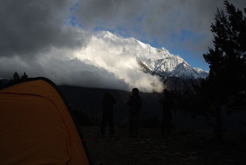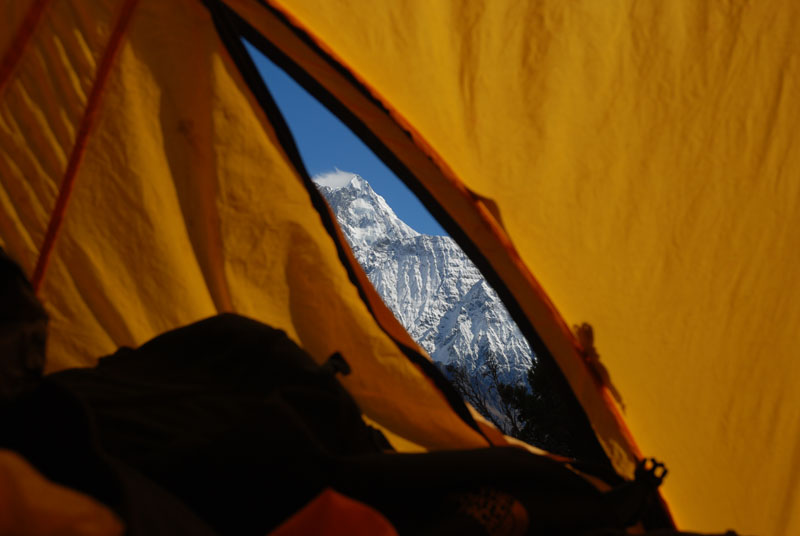太阳正高,支起帐篷,躺在里面看书,很爽。风在外面招呼大家出去看对面的NIlgiri,我觉的还是躺着比较舒服,从帐篷门瞟一眼对面的山就很美了。