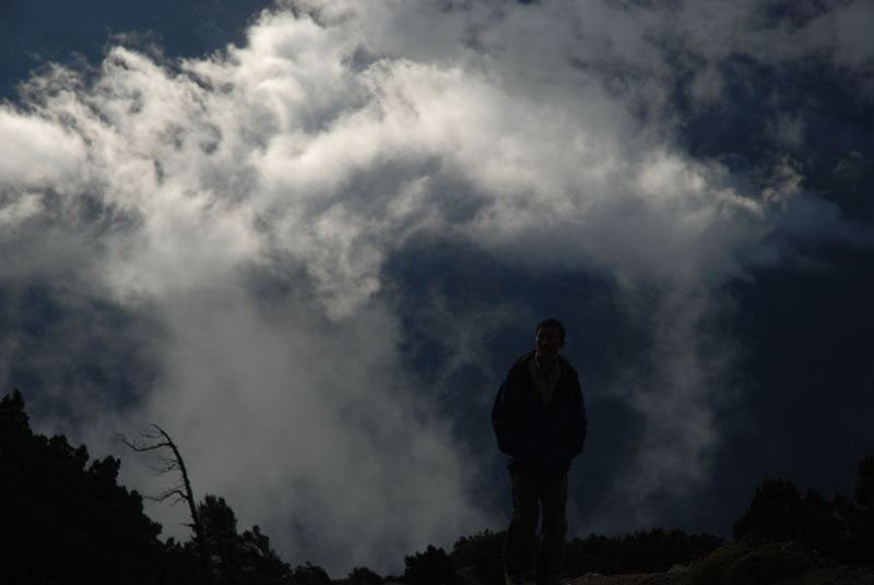 哈里波特们要吃正式的早餐,所以告诉我们8:30才出发。早上天气不错,我们在帐篷外早餐,晒太阳。脚下山谷里不时升腾起片片簿云,从我们眼前飘过,很奇幻。等他们重新分包,折腾到8:50才出发。