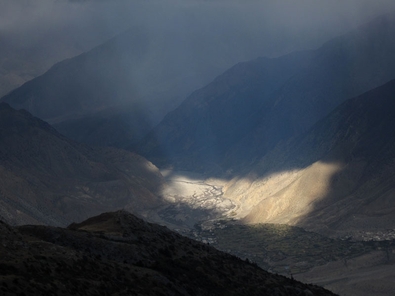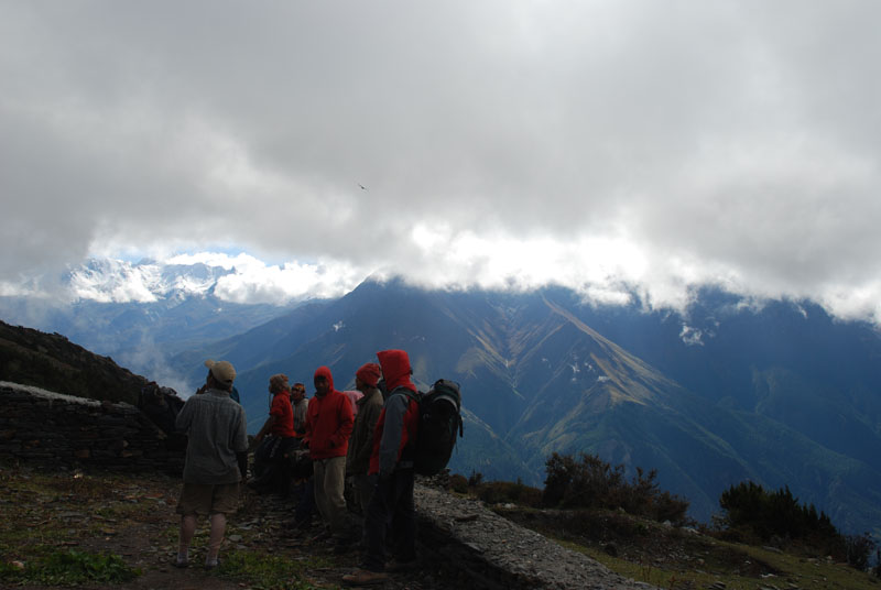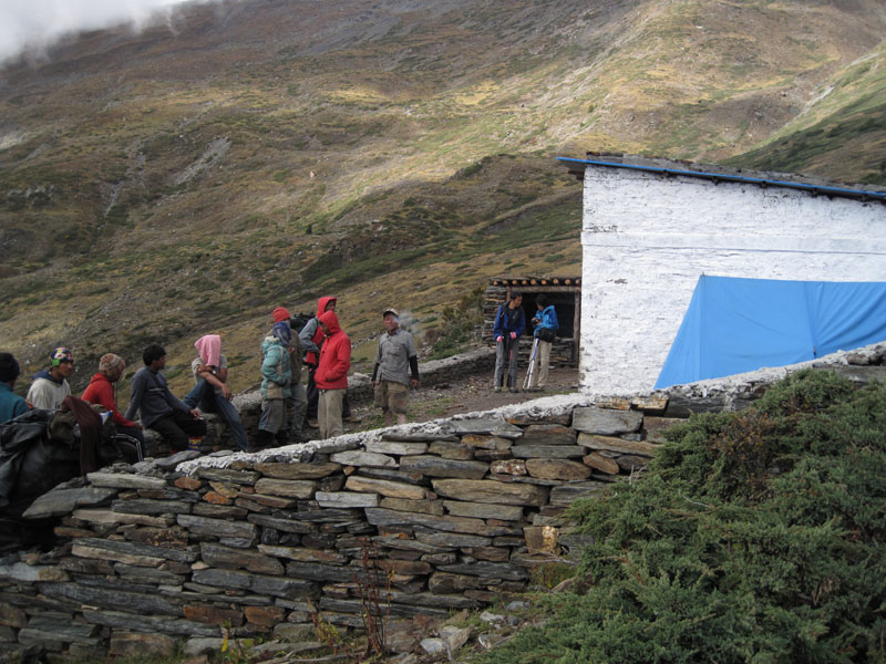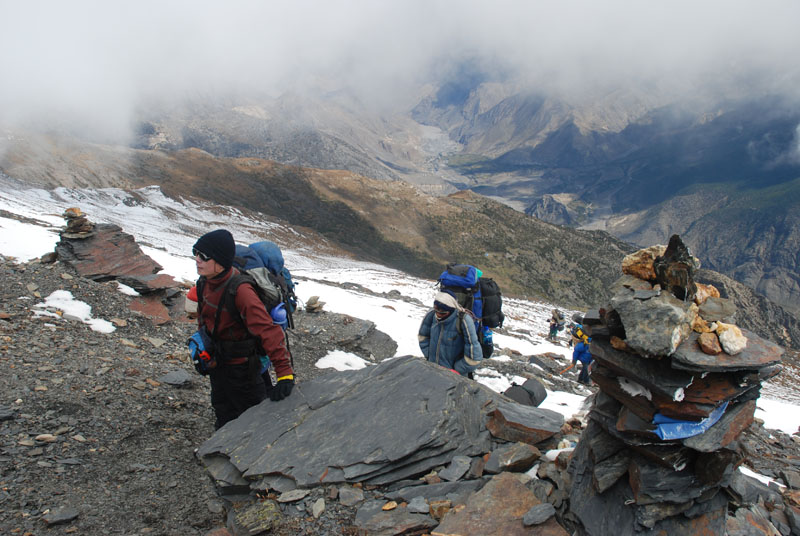 我们叫住哈里,问他现在有什么建议。他说:那3个guru族的porter经常往返marpha和dhaulagiri大本营运输物资,他们很了解山上的情况。当哈里找到他们的时候,他们认为之前山上已经下了4天的雪(山下下雨,山上肯定在下雪),这种积雪的程度,肯定找不到过山口的路。但他们希望赚几天的钱,把我们带上去,再下来。所以让哈里保持沉默。事后我想哈里之所以没有告诉我们,可能也是因为我们双方的信任程度已经很底,我们会认为他只是不想去走这条线,而这样说。