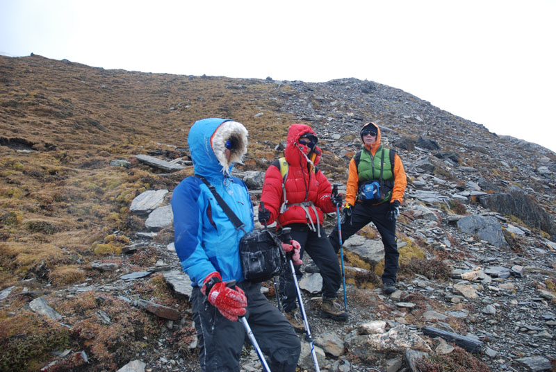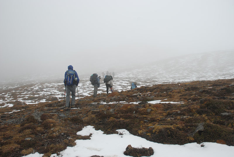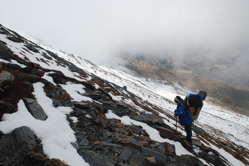 现在能见度也就20米,porter们也都不敢多休息,每次停一会儿就马上重新上路。在大风里不断翻山梁向上,感觉路越来越陡,地上的积雪开始连成片的时候,大家走得更加小心,很怕一个站不住就滚下山去。
