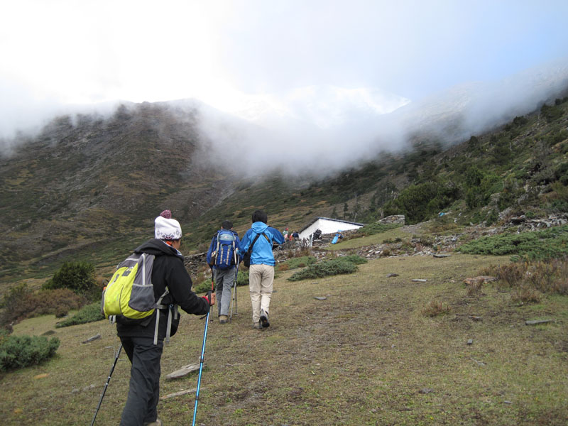 过了4000米的海拔,风开始大起来,天空也不再晴朗,不知道从哪里来了这么多的云雾,在山谷里跑得飞快,但就是看不到尽头。我感觉冷了很多,第一次停下来加上了抓绒衣,第二次停下来带上帽子,手套。但越往上,天气仿佛越恶劣。风里夹带着黄豆大小的冰粒向我们席卷而来。如果被击中,脸被打得生疼。笨笨找了一个背风的地方,我们穿上最后的衣服:羽绒服。