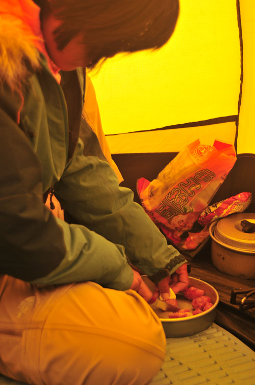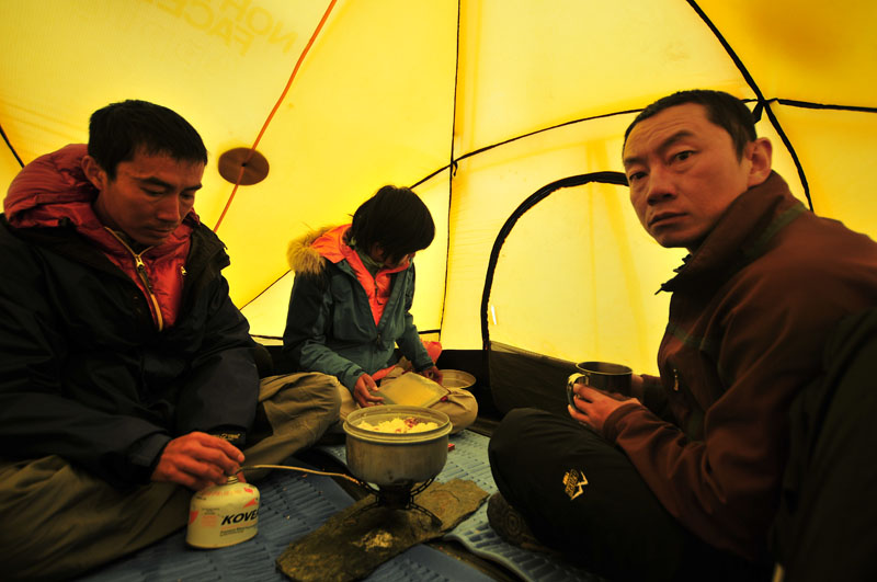 风雪还在,只是小了许多。我们赶紧建营。为了抵御大风,笨笨和风利用山上的石头把营绳拉得紧紧的。4个人钻进我们的VE25,开始烧水,吃东西。分析了一下形势,人的问题。哈里这次应该算是跟我们交底了。guru三兄弟应该是有能力带路,但他们对于雪的判断,我们不太认同。当然,今天这种天气,我们只能下撤,或者原地等一天天气。