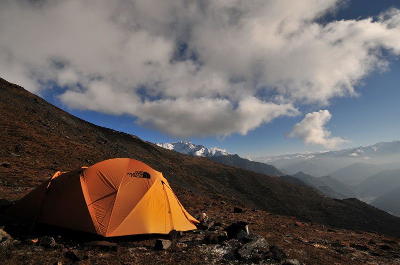 早上醒来出帐篷上厕所,石头上一层簿冰,一不小心,就滑倒在地,胳膊摔破了皮,羽绒服也被划了个口子。风和笨笨都知道我出去了,问我天气如何,我答:万里无云。笨笨说:万里乌云?风探出头来,看到来时的山谷里,背后山口的方向都没有云。说:“走啊,冲顶去。”