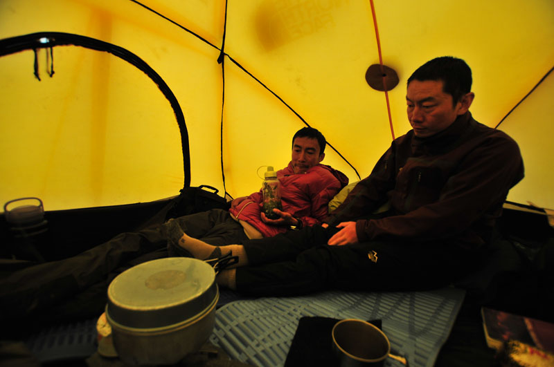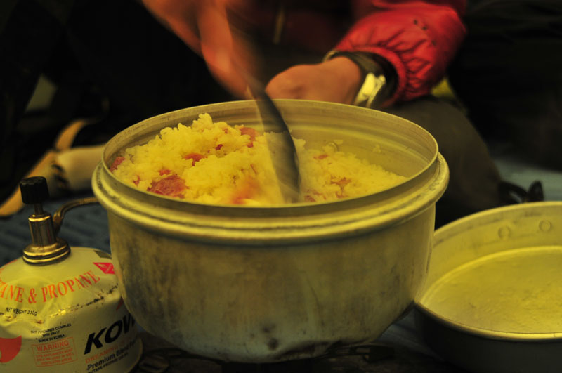 大家从食品驮袋里翻出各种珍藏的好吃的,我们把给路粮准备的各种花生,腰果,大杏仁当零食,还尝试各种鱼罐头和肉类。如果明天下山,这些食品我们就都用不上了。