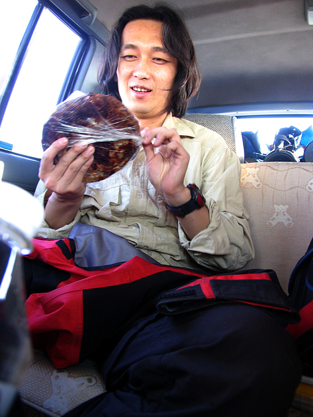 今天的目的地是门士,距离并不太远,所以我们也不着急。刚上了路,就看见路边有两男两女背着大包在走,以为是徒步的,正在佩服他们。谁知看见我们的车开过来,四个人拼命的挥手拦车,两个女生过来说她们想搭车到门士,我们的后座堆了很多的东西,而且车况还是有些问题,表示一个人没问题,两个人恐怕不行。其中一个女生很能说,最后是我们被说服了,把她们两个的大包绑上顶架,我们三个女生和一堆行李挤在了后排座。