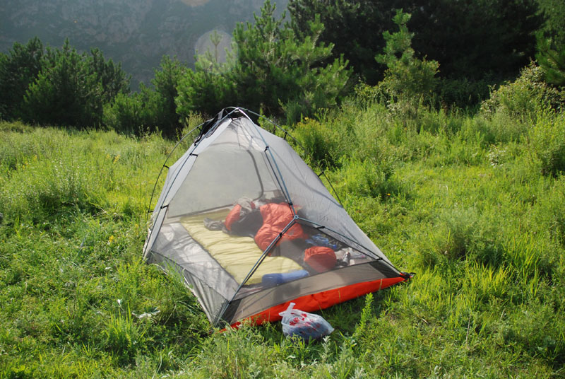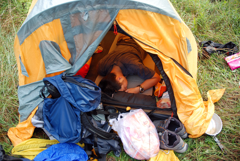 睡袋里东西太多,我几乎不能翻身。睡下的时候天还没黑,但今天起得太早,迷迷糊糊的也就睡着了。几次醒过来,发现脚还是凉的,把手里的发热贴塞到一只袜子里。我忘了管笨笨要表,完全不知道几点,脸不敢露在外面,所以连天色都看不到。