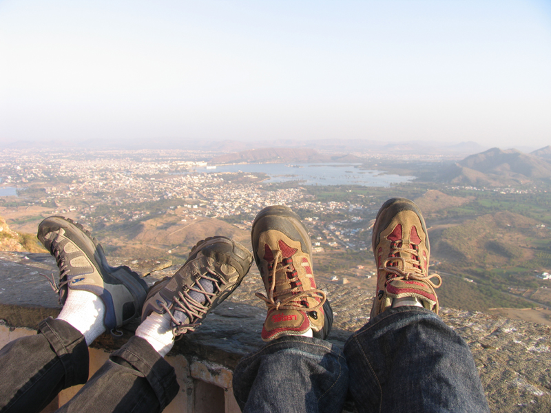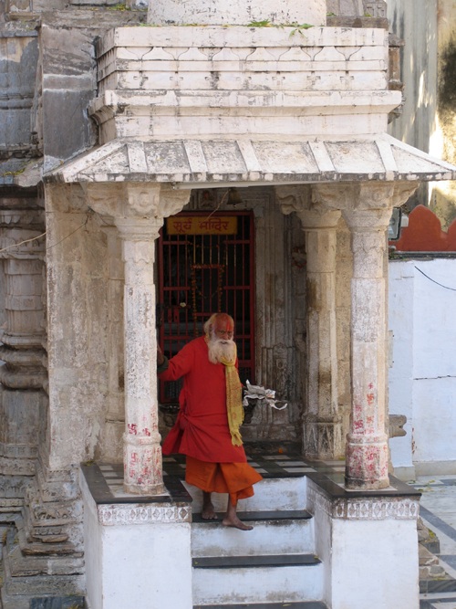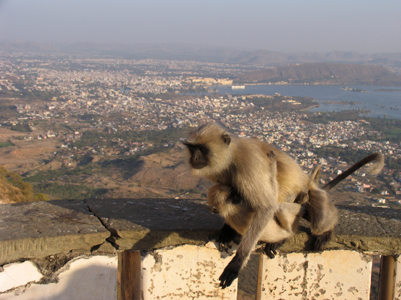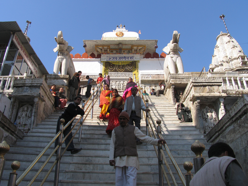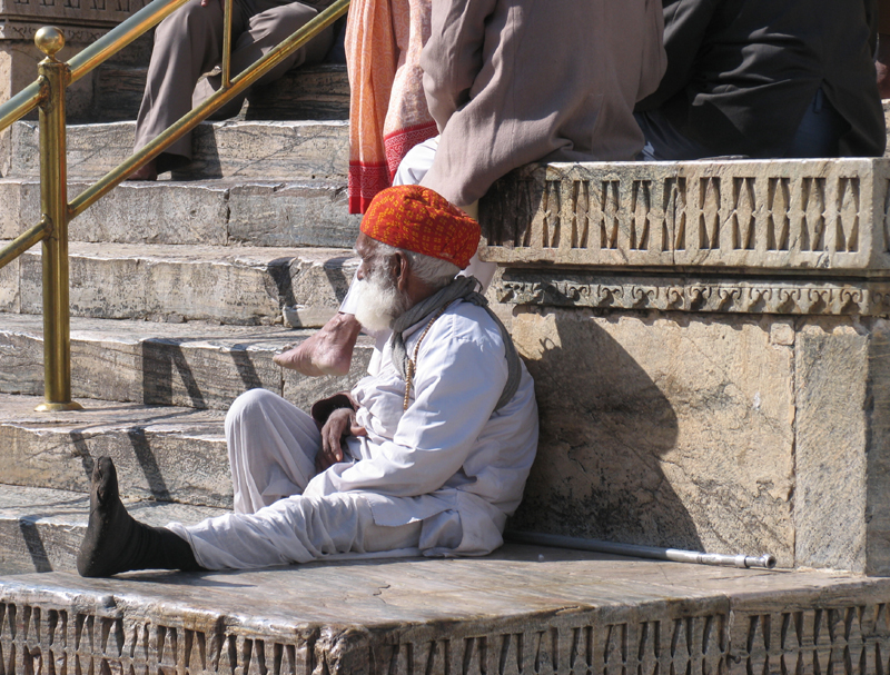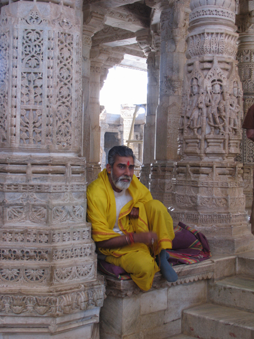 走出寺庙,拎着鞋子准备到一旁的椅子上休息,已经坐在那里的一个本地人招呼我们坐在他旁边。他是一个老师,带着一个学生开车过来参观,而他的学生正坐在另外一个长椅上与一个欧洲人聊天。看样子是出来拉练英文的。笨笨参观完Ranakpur之后,对这个寺庙崇拜得不得了,从此之后就只会说:还是耆那教牛!看看人家的寺庙。