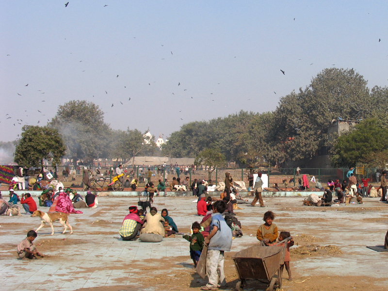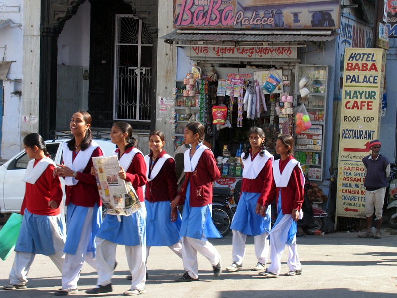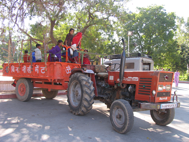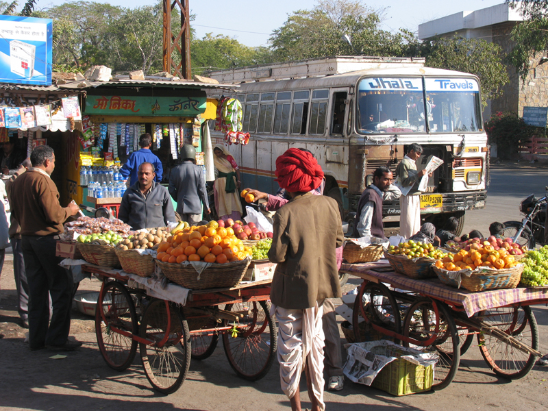 我们坐的并不是旅游巴士,而是普通的乡间大巴,虽然设置破旧,但并不脏乱。路程并不遥远,但本地大巴的特点是随时停靠,而我是很喜欢这种停靠的,门打开的时候总会上来不一样的人,带着不一样的东西,衣服、罐子、还有一捆捆的稻草。而他们的服装也永远是亮丽,迷人的。在Jaipur街头我曾经看到一个乞讨的小女孩,穿着绿色绣花的上衣和一条长长的红色大摆花裙,虽然那上面尽是尘土,但这个搭配可能连那些明星也不会做到。我不知道说她那个样子很美丽是不是很残忍,但我相信自然是公平的,它让美丽无处不在。