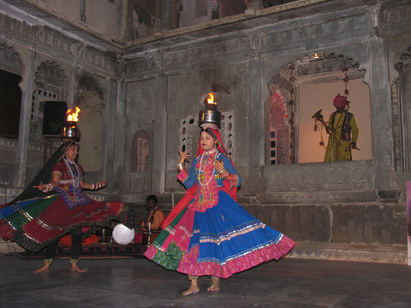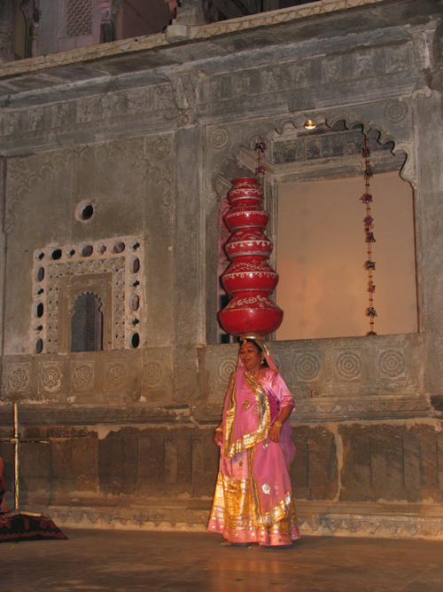 在烛光晚餐的时候,甬道上坐着的老艺人开始献歌。那是一种叫做"banna"的Rajasthan民歌。只有一个简单的乐器,全凭歌声摄人。老者的声音有些沙哑,歌声回荡在耳边的时候,整个古堡如同一个天然的剧院,将他的沧桑,镇定,还有全部感情都传达得完美无缺。如果不是他,换一个年少的男子,效果一定会大打折扣,他用的不是他的嗓子,而是人生的全部在歌唱。